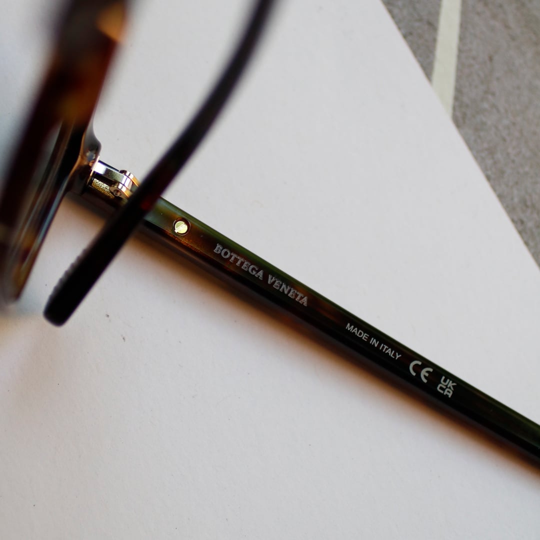 細身のテンプルにはボッテガヴェネタのシグネイチャーであるイントレチャートをアイコン化したモチーフを配置。