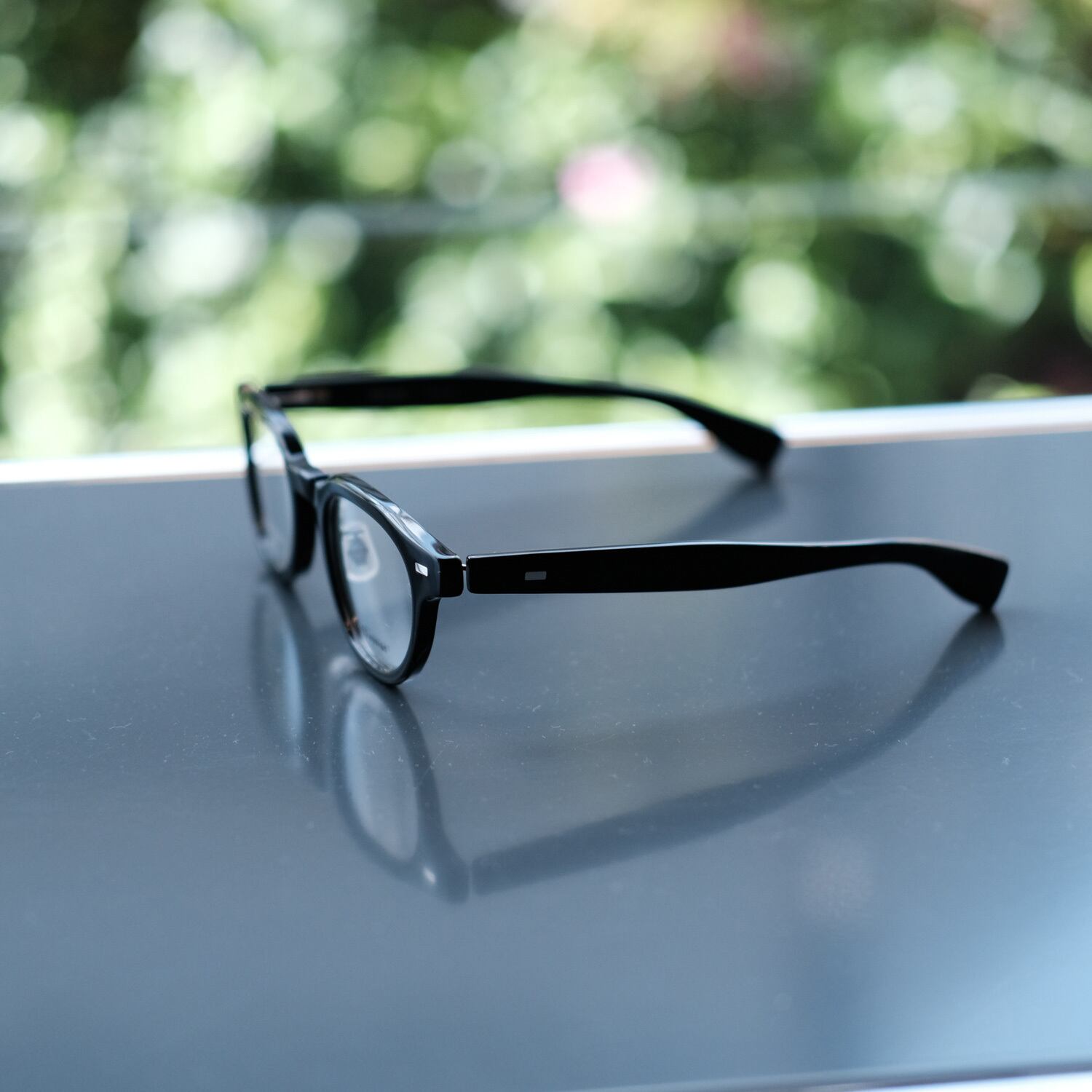 フロントは高密度で変形が少なく、人体からの影響、経年変化がしにくい特殊なプラスックであるHighcount acetate を使用。 L字型の特殊な形状を有した丁番は掛け心地の良さとオプティシャンによる調整のしやすさという目的を追求した結果生まれた形状。アセテートのモダンは適正な重量と側頭部へ接する面積を考慮し、新たに作製されたパーツ。 ボリュームのある生地感からは想像できないような軽さとフィット感を実現。掛け心地が良く、軽く、適正な強度があるという理想的なプロダクトを追求した。