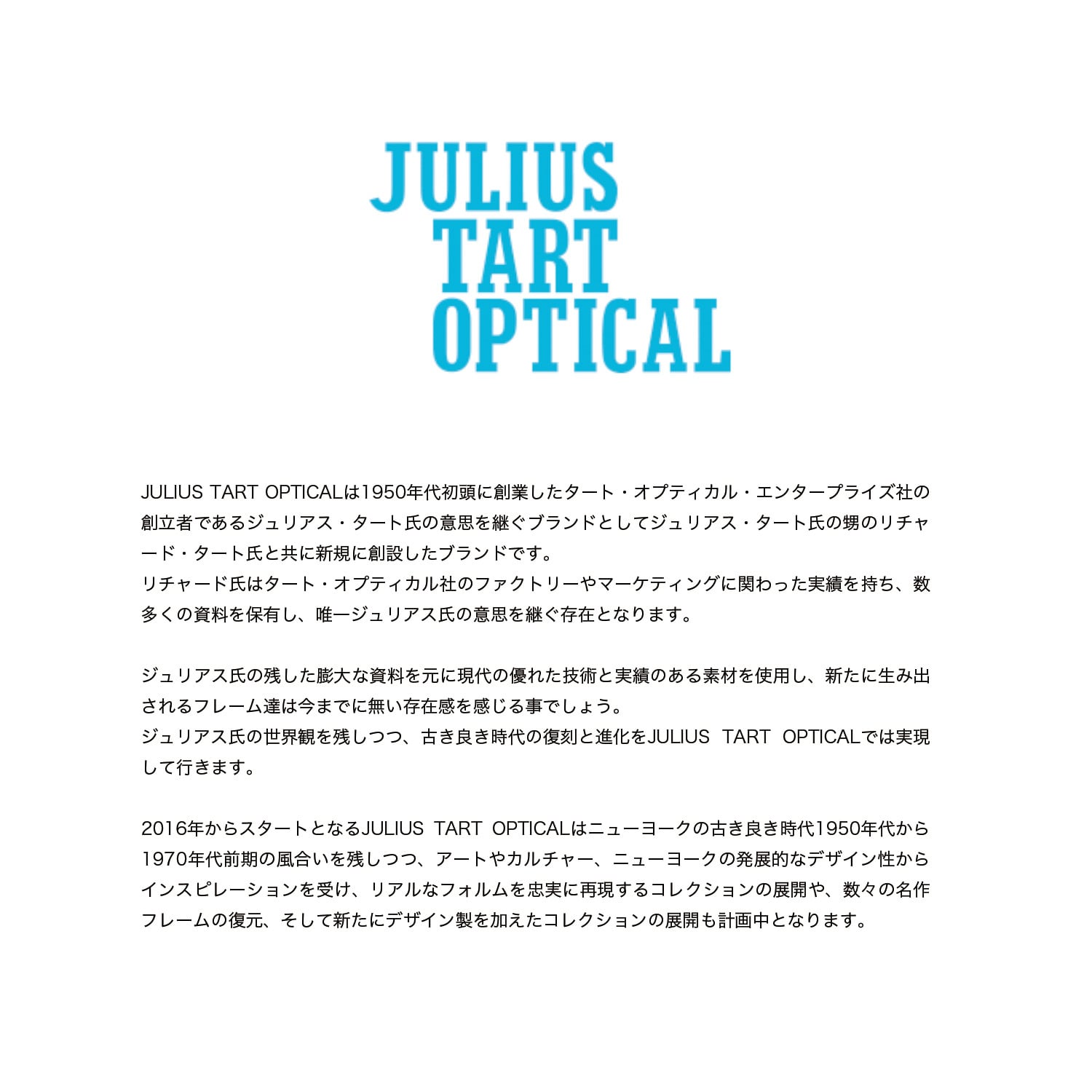 ジュリアス・タート氏の甥のリチャード・タート氏と眼鏡デザイナーのタミー・オガラ氏が共に新規に創設したアイウェアブランドである『JULIUS TART OPTICAL』はジュリアス氏の残した膨大な資料を元に日本の優れた技術と実績のある素材を使用し、新たに生み出されるフレーム達は今までに無い存在感を感じる事でしょう。ジュリアス氏の世界観を残しつつ、古き良き時代の復刻と進化をJULIUS TART OPTICALでは実現して行きます。