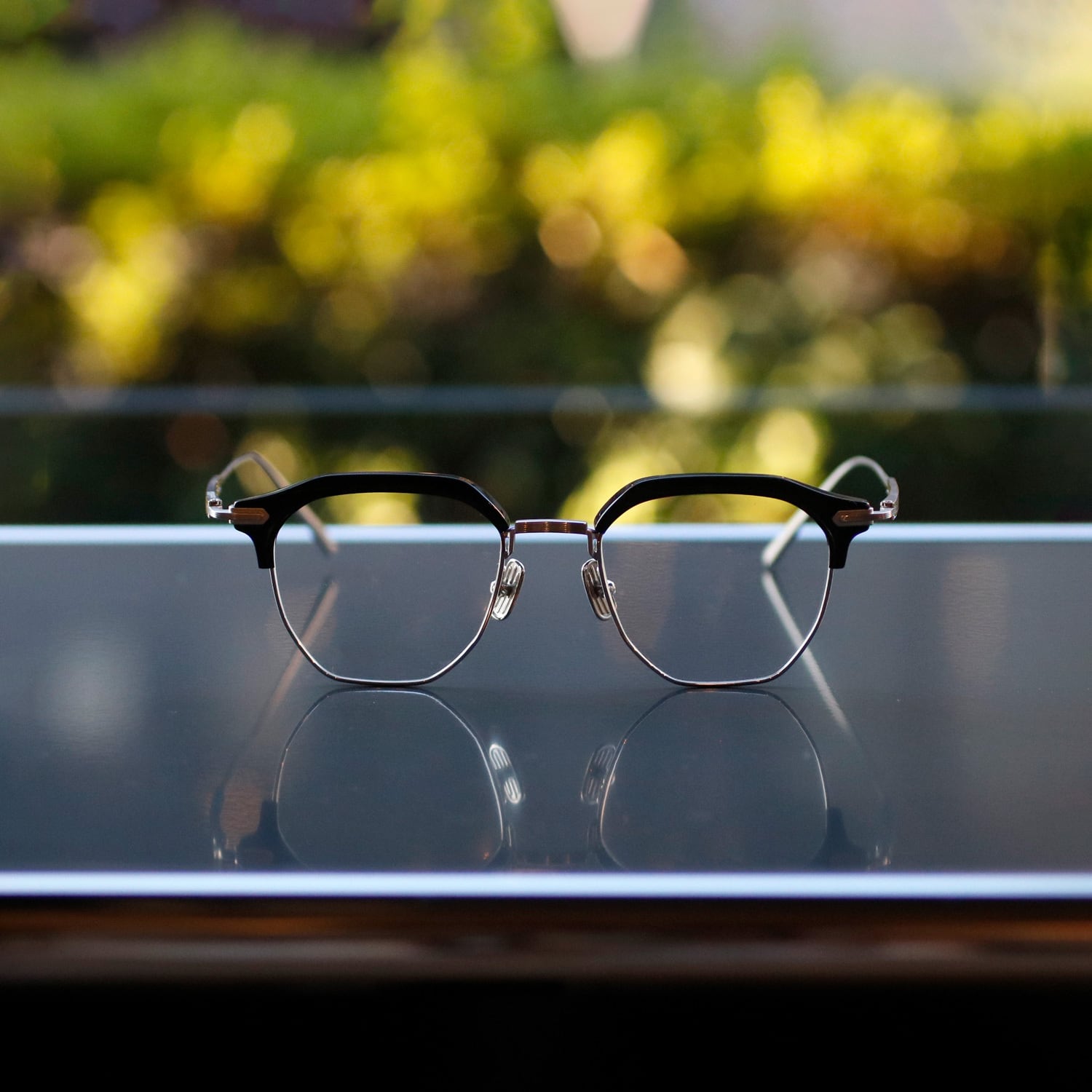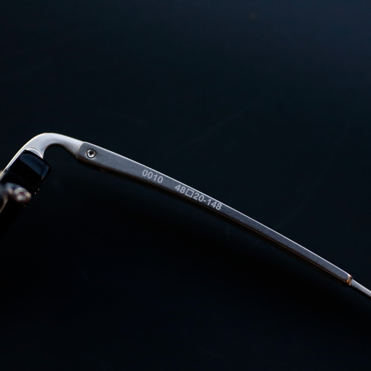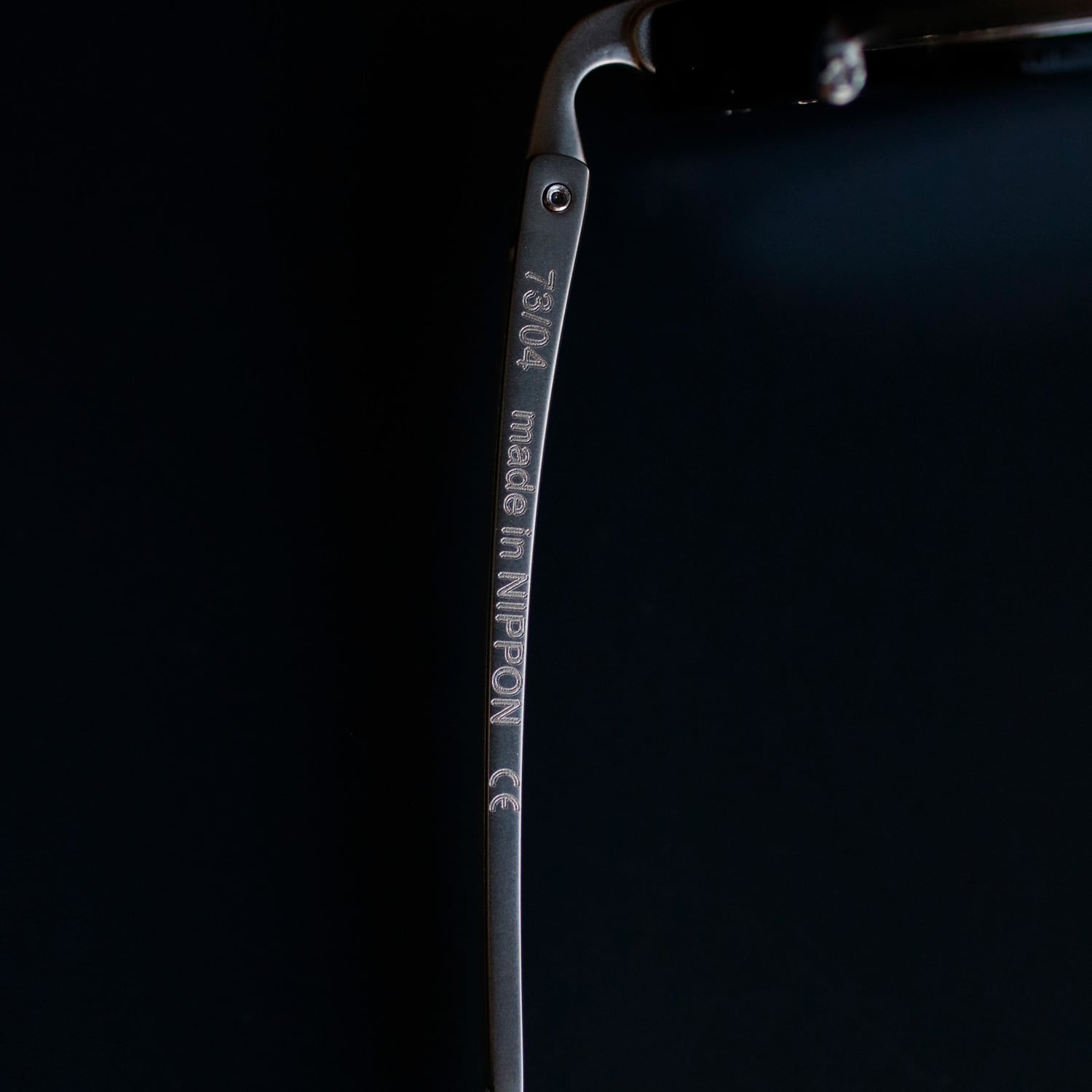 プラスティックのブローに、チタン材のヨロイと耳にかかるテンプルの異素材のコントラストが秀逸なコンビネーション。