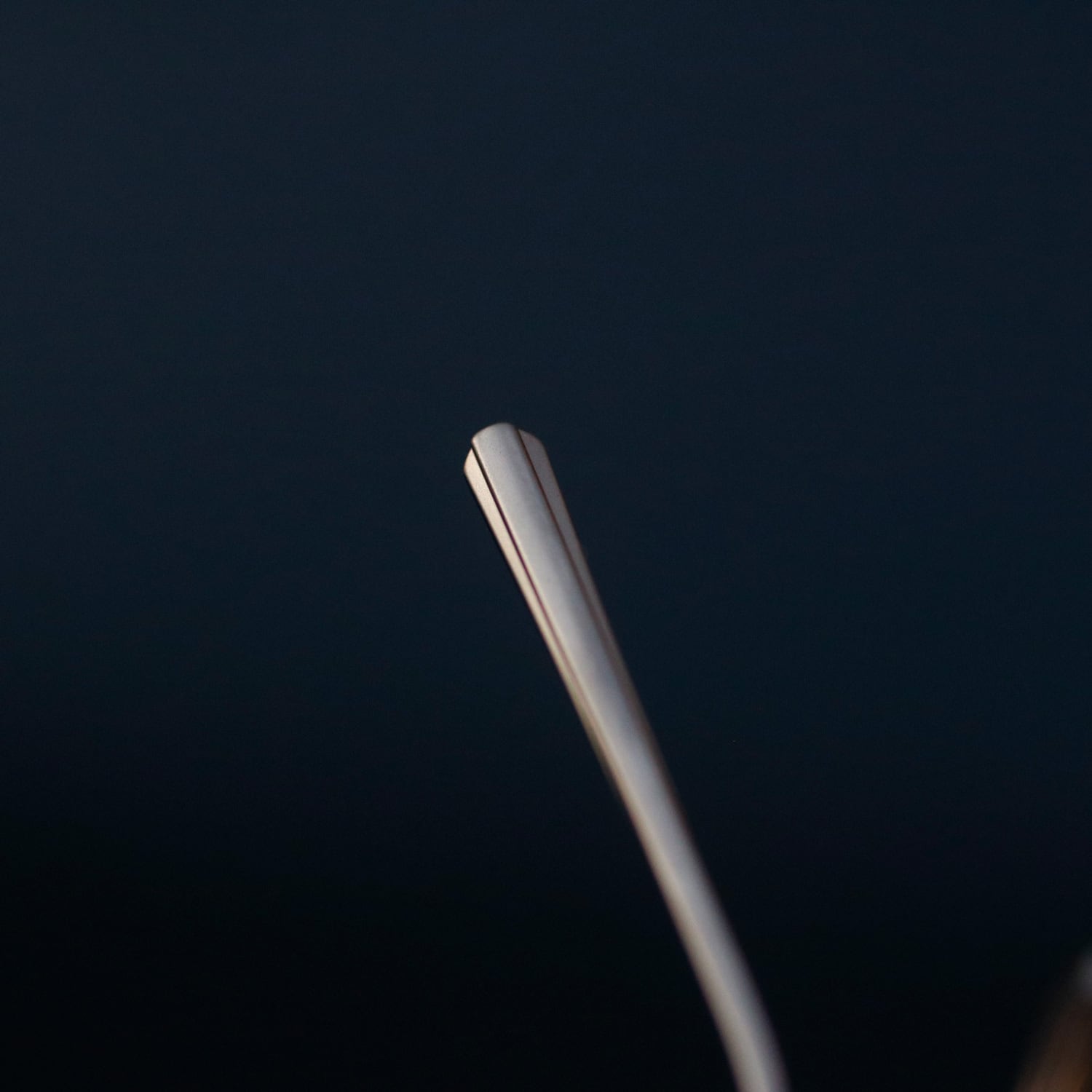 四角いレンズシェイプにありがちな、きつくみえる見た目を避けるため、変速オクタゴンシェイプとファセットブローで立体的なディティールと、掛ける人を選ばないデザインとなっている。