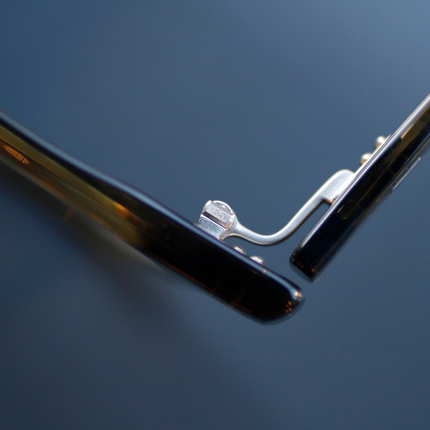 フロント部分には、高密度で変形が少なく、人体の影響や経年変化にも強い特殊なプラスチック素材「Highcount acetate」を採用。耐久性だけでなく、その美しい光沢と質感も魅力です。この素材選びが、長く愛用できるフレームの基盤となっています。